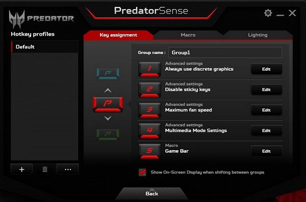 Ini adalah salah satu fitur yang ada pada Acer Predator, yang memungkinkan user untuk memberikan profil, mensetting profil laptop sesuai dengan kebutuhan. Dan dapat berpindah antar profil kapan saja. Anda juga dapat mengubah pencahayaan disini. Dan menyesuaikan berbagai fitur lainnya.